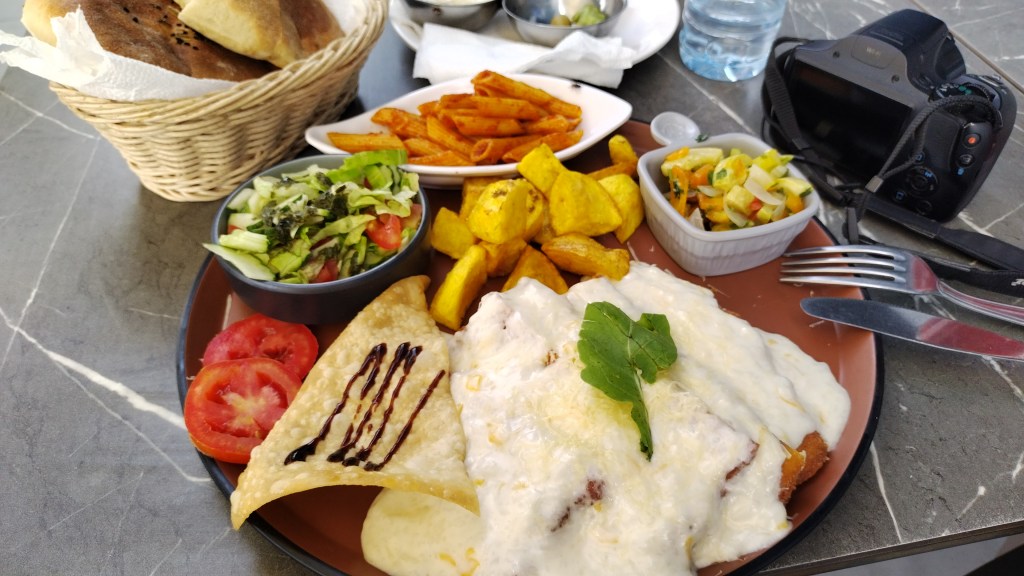 Salí del museo y me dirigí a la pequeña ciudad de Monastir. Como toda esta área mediterránea, recibe mucho turismo ya que sus playas son verdaderamente bonitas; pero, para alguien como yo que no busca eso, no vale la pena ir. Es muy sucia, fea y desorganizada. Almorcé en un restaurante cerca de la playa, donde pedí un pollo apanado con queso fundido y adicionalmente me trajeron un sinnúmero de platos pequeños con diferentes ensaladas, todo por 8 euros. Estaba delicioso.
